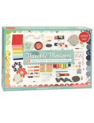 Puzzle 28 in x 20'' in --1000 Pieces The perfect gift for quilters and puzzle lovers alike, the Thimble Blossom Jigsaw Puzzle is a fun, challenging way to celebrate crafting. Vibrant scene from blogger, author and creator Camille Roskelley.
