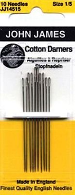 John James Darners Size 7. Short Darners are sometimes referred to as Cotton Darners. They are hand sewing needles with sharp points and long threading eyes and are commonly used for mending and darning using cotton and yarn. Short Darners are available in size 5, size 7 and size 9 in packs of 12 sewing needles. 12 cards per box.