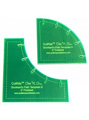 This Drunkard''s Path template set (2 templates) is sized to work nicely with 5-inch pre-cut squares Our patent-pending Slit ''N SewTM method represents a truly revolutionary improvement by allowing curved piecing to be done quickly and easily each and every time! Using the CutRiteTM Slit ''N Sew templates, simply use a rotary cutter to make small cuts that are precisely located on the templates. Then proceeding a slit at a time, line up the next slit from each piece that is being pieced together and sew to that slit. The result? A perfect curved piecing job in no time! No tedious and time-consuming pinning! No paper piecing! May be performed by quilters of all skill and experience levels. Works for non-curved shapes such as diamonds and tumblers - just match the slits and the points line up automatically! Ideally sized to work with standard pre-cuts, such as 5 in and 10 in squares, or use with other fabric that you have. Easy to see fluorescent green acrylic color! Includes CutRiteTM HandiGrabber material to keep template securely in place.
