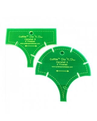 This Clamshell template set (2 templates) is sized to work nicely with 10-inch pre-cut squares. Our patent-pending Slit ''N SewTM method represents a truly revolutionary improvement by allowing curved piecing to be done quickly and easily each and every time! Using the CutRiteTM Slit ''N Sew templates, simply use a rotary cutter to make small cuts that are precisely located on the templates. Then proceeding a slit at a time, line up the next slit from each piece that is being pieced together and sew to that slit. The result? A perfect curved piecing job in no time! No tedious and time-consuming pinning! No paper piecing! May be performed by quilters of all skill and experience levels. Works for non-curved shapes such as diamonds and tumblers - just match the slits and the points line up automatically! Ideally sized to work with standard pre-cuts, such as 5 in and 10 in squares, or use with other fabric that you have. Easy to see fluorescent green acrylic color! Includes CutRiteTM HandiGrabber material to keep template securely in place.