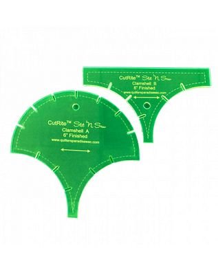 This Clamshell template set (2 templates) is sized to work nicely with 5-inch pre-cut squares. Our patent-pending Slit ''N SewTM method represents a truly revolutionary improvement by allowing curved piecing to be done quickly and easily each and every time! Using the CutRiteTM Slit ''N Sew templates, simply use a rotary cutter to make small cuts that are precisely located on the templates. Then proceeding a slit at a time, line up the next slit from each piece that is being pieced together and sew to that slit. The result? A perfect curved piecing job in no time! No tedious and time-consuming pinning! No paper piecing! May be performed by quilters of all skill and experience levels. Works for non-curved shapes such as diamonds and tumblers - just match the slits and the points line up automatically! Ideally sized to work with standard pre-cuts, such as 5 in and 10 in squares, or use with other fabric that you have. Easy to see fluorescent green acrylic color! Includes CutRiteTM HandiGrabber material to keep template securely in place.