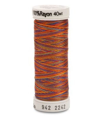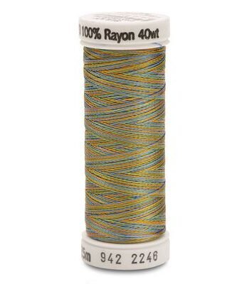 Light weight, but exceptionally strong, silky rayon thread. Good for machine quilting, applique and free-motion machine embroidery. Color-fast. Machine needle size most commonly recommended: 12/80. Can also be used as a bobbin thread with 30 wt as the top thread. Available in 36 Variegated and 18 multi color combinations. 250yd per spool, 3 spool per box.