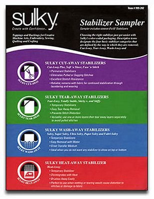 Choosing the right stabilizer just got easier with Sulky''s color-coded packaging. Descriptive icons designate the four basic stabilizer categories that are defined by the way in which they are removed - Cut-Away, Tear-Away, Wash-Away and Heat-Away. This Stabilizer Sampler Pack is a wonderful teaching tool and is also the perfect way to purchase all the Sulky Stabilizers very inexpensively. Then you can choose with confidence just those stabilizers that work best for you. Package contains (1) 8 X 10 sheet of all 19 styles of Sulky stabilizers.