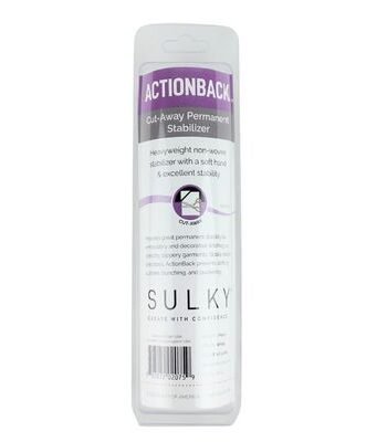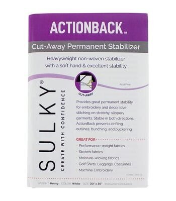 Sulky ActionBack is a permanent, cut-away stabilizer designed to provide superior permanent stability for embroidery and decorative stitching on stretch, slippery fabrics. ActionBack is stable in both directions to prevent drifting outlines, bunching and puckering. Easily embroider performance-weight fabrics that have varying degrees of stretch, such as moisture-wicking, spandex, microfiber, and more!This cut-away variety remains as a separate layer behind the fabric after embellishing to retain the fabric stretch and drape. ActionBack also supports all sorts of stitch densities, from lightweight line-art styles to heavy stitch fills, without puckering or buckling. Fiber Content: 50/50 Poly/Cotton Blend.