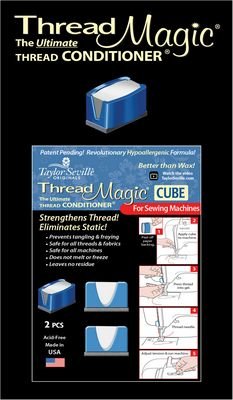 The Ultimate Thread Conditioner. Strengthens thread while eliminating static. Prevents tangling and fraying. Safe for all threads and fabrics. Safe for all machines. Does not melt or freeze. Leaves no residue. 1 each of Thread Magic Round and Cube sizes per card.