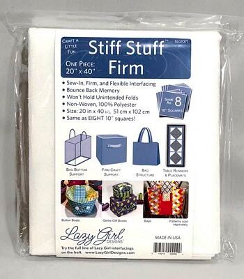 Four 10in squares (SLG107SQ) . Firm, flexible, sew-in, non-woven support for small to medium crafts Soft enough to turn project right sides out. Perfect to add a little structure to your next craft project without added bulk or weight. 10in x 10in (25.4cm x 24.5cm), 100% polyester, non-woven, machine wash, dry low. Made in USA. Use with Lazy Girl Designs patterns: LGD138, LGD139, LGD140, and LGD141.