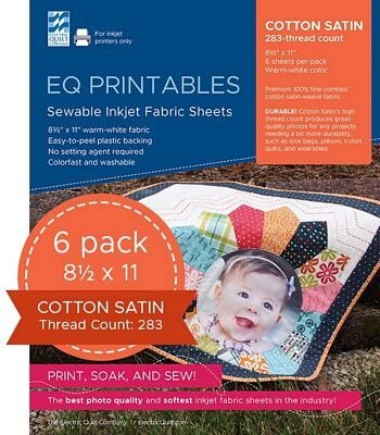 Premium Cotton Satin fabric for inkjet printers. Thread count 283 perfect for photo printed purses wearables pillows & other crafts. You become a fabric designer as you scan in photos flowers or whatever. Print on satiny cotton with a thread count so fine that fabric texture will not be noticeable. You''ll be amazed at how beautiful your photographs look. Package includes 6 sheets size 8.5x11 **The Electric Quilt Company items may not be sold on Amazon, Walmart.com or any other marketplace website. The Electric Quilt Company items may not be sold to unauthorized third parties that resell on a marketplace website. Brewer customers who disregard this policy may have purchase orders cancelled or accounts terminated. **
