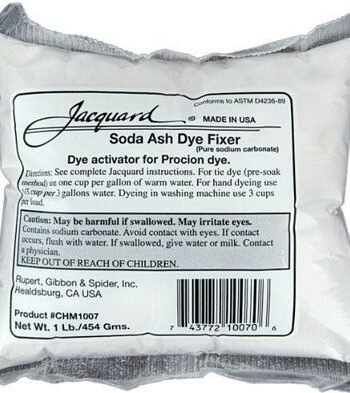 Soda Ash dye fixer is a mild alkali that promotes the chemical reaction between Procion MX fiber reactive dyes and cellulose fiber. It is also known as sodium carbonate washing soda or sal soda. Soda Ash is necessary to activate and set Procion MX dye.