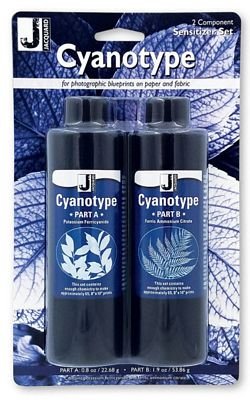 Cyanotype is the “original” sun-printing process, one of the earliest photographic techniques. Discovered in 1842 and distinctive for producing rich, Prussian blue monochromatic prints, Cyanotype was popular well into the 20th century as an inexpensive method for reproducing photographs, documents, maps and plans (hence the enduring architectural term “blueprint”) and famously, for making impressions of biological specimens in the field (“photograms”). Harness the power of the sun to make detailed prints from virtually any object that casts a shadow: tools, toys, plants, leaves, stones, sand, string, lace, etc. Simply place the object on the sensitized surface and expose to sunlight (UV). Use a digitally-printed photographic negative (an inverted black and white photo inkjet-printed onto a transparency*) instead of an object to create full-resolution photographs on paper or fabric. Great for photographers, mixed media artists, printmakers, quilters, kids and more, the cyanotype process is easy, forgiving, quick, magical and fun. Capture the nuance of every shadow— a fun group activity for any age! This set contains enough chemistry to make approximately sixty-five 8" x 10" prints on paper or fifty 8" x 10" prints on fabric. FABRIC/FIBER/SURFACESany natural fiber/porous surface, including cotton, linen, silk, canvas, wood, and leather. Set includes 2—0.8 oz/22.68 g bottles (1 each of the following): Part A: Potassium Ferricyanide—A red iron salt used with Ferric Ammonium Citrate for cyanotype. Part A: Potassium Ferricyanide—A red iron salt used with Ferric Ammonium Citrate for cyanotype.