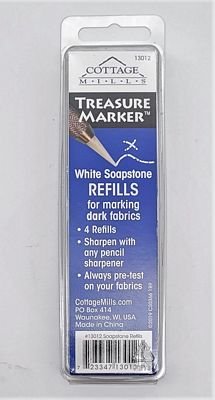 The white soapstone Treasure Marker refill set comes with 4 inserts for marking dark fabrics and rubs or washes out easily. Easily sharpen with a pencil sharpener. Used for marking on dark fabrics. Marks generally rub off or wash out, however always test in a small, inconspicuous spot first. CM13600