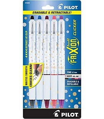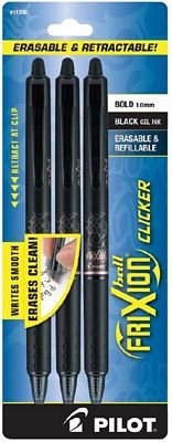 Pilot FriXion Ball Erasable Gel Pens allow you to erase and rewrite repeatedly without damaging documents. The thermo-sensitive gel ink formula disappears with the erasing friction of a rubber tail plug eraser on the pen. Erasing leaves no residue or debris. Each pen can write on the same spot that has been erased and delivers smooth writing gel ink and is not recommended for signatures, examination papers or official documents where writing needs to remain permanent or for exposure to extreme temperatures. Extra fine 0.05 mm, black gel ink, white barrel.