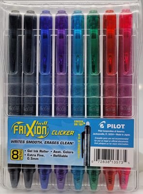 Writes smooth & erases clean, so you can write, erase & rewrite repeatedly without damaging documents – no wear or tear! Unique, thermo-sensitive gel ink formuladisappears completely with erasing friction. Retract by pressing clip down. Size 0.5 mm. 8 Colors: 2 Black, Blue, Red, Green, Pink, Purple, Turquoise.