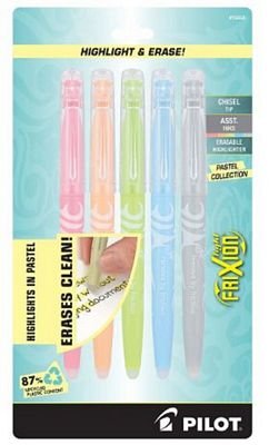 Highlights in Pastel, Erases Clean. Available in 5 pastel ink color optionsthat add subtle mphasis to your work. Highlight and erase repeatedly without damaging books or documents. No wear or tear!• Unique, thermo-sensitive ink formula disappears with erasing friction. Contains 87% recycled content. 5 Colors: Salmon, Orange, Lima, Pink, Grey.