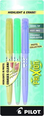 Highlights in Pastel, Erases Clean. Available in 3 pastel ink color optionsthat add subtle emphasis to your work. Highlight and erase repeatedly without damagingbooks or documents. No wear or tear! Unique, thermo-sensitive ink formula disappearswith erasing friction. 3 Colors: Yellow, Green, Purple