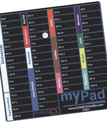 Machine Needle Organizer- Felt pad holds still sharp machine needles in labeled cells Flower pin shows which needle is in use. Helps you keep track of your needle types! This pad measures 6.75in x 6.75in.