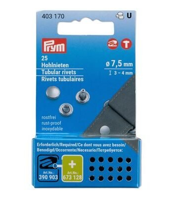 These hollow rivets are made of rust-proof, silver-colored brass and offer visually clean results for every application. They are intended for material thickness 3 - 4 mm. Prym offers hollow rivets for use with the VARIO Creative Tool (390903) and the matching tool set (673120).