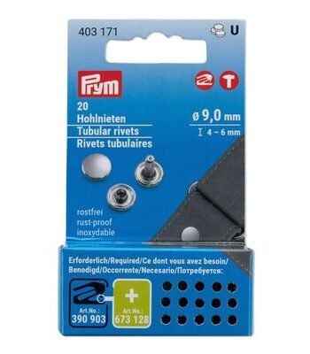 These hollow rivets are made of rust-proof, silver-colored brass and offer visually clean results for every application. They are intended for material thickness 6 - 9 mm. Prym offers hollow rivets for use with the VARIO Creative Tool (390903) and the matching tool set (673120).