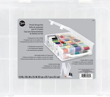 Keep your thread spools organized and dust-free in the double-sided Dritz Thread Storage Box. The box contains removable dividers so your various types and sizes of thread spools can be stored in the same box. The sturdy box features a handle on the end the box for easy carrying and it folds down for compact storage. Double-sided box with 48 compartments. Transparent for easy thread color visibility. Sturdy construction with secure latch closures. Removable dividers allow customization to fit spool shapes and sizes Folding handle on end of box. Includes one double-sided box with 4 latches, one handle, 48 compartments and 42 removable dividers (Thread not included). Size 13 in x 10 1/8 in x 3 1/4 in **Map Pricing** MAP $27.39 This item is subject to a Minimum Advertised Pricing Policy (MAP price listed) Full Brewer MAP policy details are available for review on our website under the Shop Resource tab.