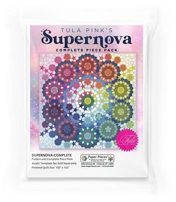 Supernova by Tula Pink is an epic expansion of her beloved Tula Nova design perfect for experienced English Paper Piecers and ambitious beginners alike. Inspired by the mathematical beauty of Penrose tiles, this quilt combines eleven original Tula Nova stars into on dramatic, showstopping layout. The result? A stunning quilt bursting with color, symmetry, and signature Tula style. Finished Size: 103" x 102" Over 2,400 Pieces + 10-page Full Color Pattern with Coloring Page Special Note: Supernova uses the same Acrylic Fabric Cutting Template Set as Tula Nova. *Fabric not included