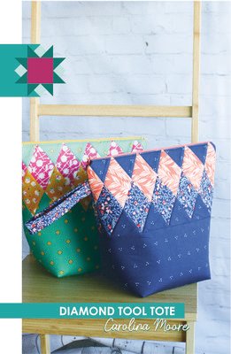 This tote is stylish and fuctional! The fun diamond design adds some dimension to this bag that has a wide mouth and plenty of depth. Great for sewing tools like rotary cutter, scissors, pens, pin cushion, and more… but also perfect as a makeup tote, tech pouch, and more! You''ll find so many handy uses for this bag! Optional carry handle instructions included. This pattern is written for use with the Boxed Bag Template.
