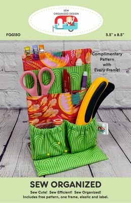 Sew Cute! Sew Efficient! Sew Organized! Store your sewing and crafting essentials within easy reach. Eight pockets and a pincushion slide onto a sturdy steel frame. Kit includes: Instructions, Frame, Elastic and Label. Uses 2 fat quarters or large scraps and stabilizer. Size: 5-1/2 in x 8-1/2 in. Goes together quickly! ogether quickly!