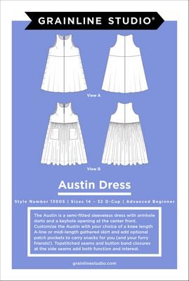 Austin is a semi-fitted sleeveless dress with armhole darts and a keyhole opening at the center front. Customize the Austin with your choice of a knee length A-line or midi-length gathered skirt and add optional patch pockets to carry snacks for you (and your furry friends!). Topstitched seams and button band closures at the side seams add both function and interest.