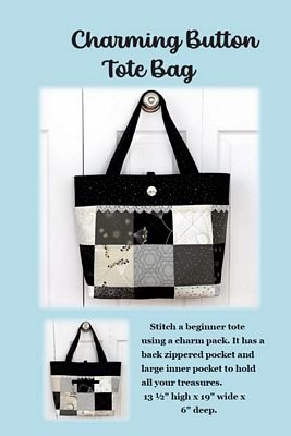 Stitch a fast and fun beginner patchwork tote bag with a single Charm Pack! Trim with your favorite lace or any fun trim for a personalized touch. The Charming Button Tote has a large, covered button, or you can can choose a button from your collection. This tote has an optional zippered or patch pocket on the back. It is fully lined with an interior pocket. This tote will be a favorite you will reach for again and again! The fused handles with grosgrain ribbon give it a finished look and make the handles extra durable! Browse our selection of Charm Packs to get inspired! Finished Size: 13-1/2 in high x 19 in wide x 6 in deep.