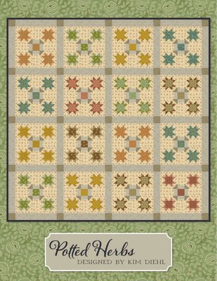 The Potted Herbs Quilt Pattern by Kim Diehl showcases star blocks that resemble seedlings sprouting. In shades of sage green and golden yellow, this quilt is as charming as a windowsill full of growing herbs and features the Autumn Thyme fabric collection.Finished size: 58.5in x 58.5in