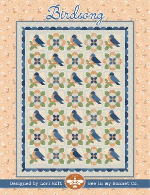 The Birdsong Quilt Pattern by Lori Holt of Bee in my Bonnet features bluebirds joyfully singing. This quilt showcases alternating blocks of birds and flowers, creating a melodic patchwork design. The finished quilt boasts a triple border, complete with one of Lori''s signature distinctive scrappy inner borders. It is perfect for intermediate quilters who appreciate small piecing. Finished size: 74.5in x 98.5in.