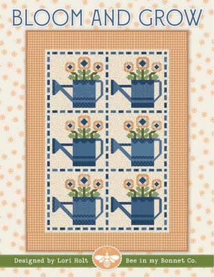 The Bloom and Grow Quilt Pattern by Lori Holt of Bee in my Bonnet features large novelty blocks that create the illusion of appliqued designs. This quilt features six blossom-filled watering cans in shades of blue and yellow, bringing the essence of summer skies and buttercup flowers indoors for year-round enjoyment. The dash border is reminiscent of running stitches, while the outer border features cheerful yellow gingham, reminding you to bloom and grow wherever you are planted. Finished size: 63.5in x 86.5in.