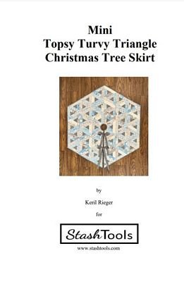 (P11) Mini Topsy Turvy Triangles Christmas Tree Skirt is approximately 37" x 42". This tree skirt is a great way to use your stash, or it can be made in totality from a pre-cut 2.5” strip roll. Center triangles are built out to make larger triangles. The larger triangles are then placed into rows and made into a tree skirt. This pattern requires StashTools Wedge Template Set 5, Brewer # _____ .