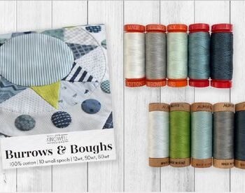 Burrows & Boughs by Jen Kingwell is a narrow palette of blues, greens,and greys combined to create a sophisticated and refined quilt with atouch of whimsy. It is made in GreenStone, Jen’s latest range with Moda Fabrics. Jen mixed the techniques of machine & hand piecing with appliqué to create this hybrid sampler style / medallion quilt. Jen curated 10 Small Spools of 100% Aurifil Cotton in 50wt, 12wt, and80wt to ensure that all makers have the tools needed to create Burrows & Boughs with confidence and success. **Aurifil prohibits customers from selling on Amazon or unauthorized third-party sellers to resell on Amazon. Brewer customers who disregard this policy may have purchase orders cancelled or accounts terminated. **