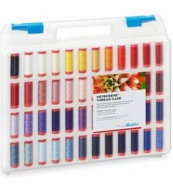 This transparent thread case is filled with 96 colors, one spools each, of METROSENE (R) in the 150m length. 100% Polyester Sew All thread to use with cottons, synthetics, mixed farics, linen and silk. Included is a METROSENE (R) color card, which gives you an over-view of the whole color range. Each spool is set in an integrated foam insert and marked with a color number.