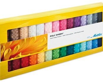 Consists of 28 spools of Mettler Polysheen Plus art#3406-. 220yds per spool. Colors included: 0581, 0771, 0738, 0600, 0594, 0828, 0500, 0803, 0669, 0554, 0852, 0850, 0780, 0952, 0003, 0700, 0624, 0513, 0703, 0002, 0692, 0667, 0712, 0916, 0675, 0569, 0672, 0749.