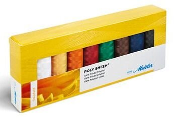 Consists of 18 spools of Mettler Polysheen Plus art#3406-. 220yds per spool. Colors included: 1912, 1902, 1102, 0630, 5531, 5422, 4515, 3323, 3641, 1346, 0853, 1140, 0015, 2560, 2520, 2810, 0112 and 0020.