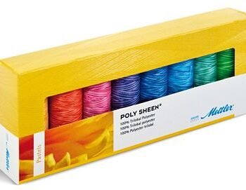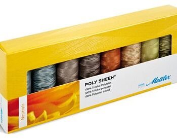 Consists of 4 spools of Mettler Polysheen Plus art#4820-. 218yds per spool. Colors included:9983, 9973, 9972, 9977. Also contains 4 spools of Mettler Polysheen Embroidery art#3406-. 220yds per spool. Colors included:2530, 2912, 4122, 5730.