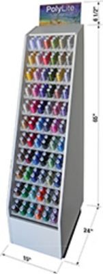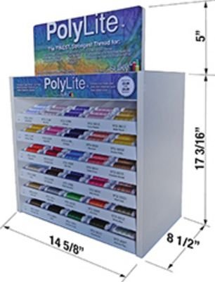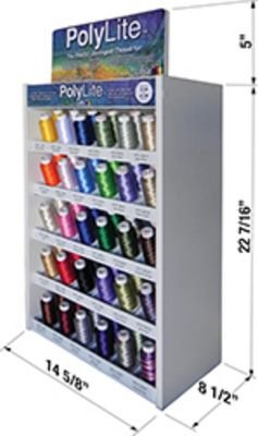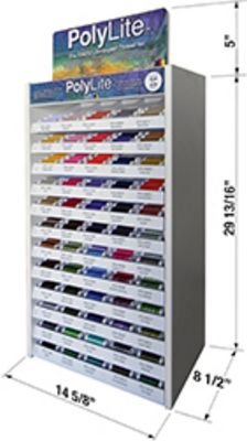 60wt Polylite 1,650 yd Maxispools, solid and multis. Top 30 colors, (18 solids,12 multis) 5 row/6 column countertop / pegboard / slatwall unit. 2 spools per color DROP SHIP - FREIGHT INTENSIVE Freight Intensive items are non-returnable. Billable transportation charges for freight intensive items will be the greater of the dimensional weight compared to the actual weight. In addition to transportation charges, freight carriers may assess an additional oversize charge per package.