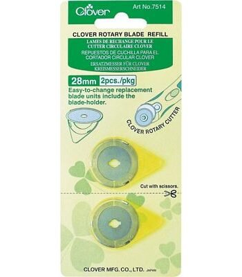 Clover Rotary Cutters are designed to cut fabric with just the right amount of blade exposed, whether held upright or at an angle. These blades have a practical soft-cushion handle that fits right in your hand. Convenient for both right and left hands. Read instructions carefully. Size is 28 mm.