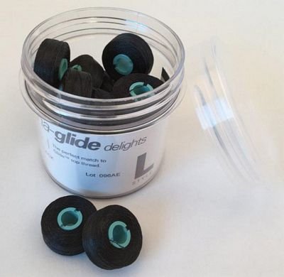 Fil-Tec Magna-Glide Delights 120×2 High Tenacity Trilobal Polyester No. 40 Tex 27 Prewound Bobbins. The magnetic core rotates the bobbin consistently throughout the entire bobbin which results in uniform tension to the last stitch. Consistent tension throughout the bobbin increases stitches per bobbin. This equates to more time quilting and fewer bobbin changes. No backlash or overspin issues. 20 L-style prewound bobbins per jar/72 yards of thread per bobbin. FILTEC