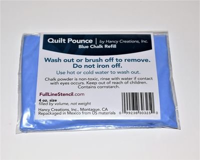 4oz Blue Chalk Refill. Wash out or brush off to remove. DO NOT iron off. Use hot or cold water to wash out. Chalk powder is non-toxic. Contains cornstarch.