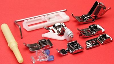 Includes straight stitch foot, hemming foot, sliding buttonhole foot, button sew on foot, zipper foot, cording foot, blindhem foot, overcast foot, zigzag foot and High shank ankle. Storage box no longer included. Box if needed is item 450-2.
