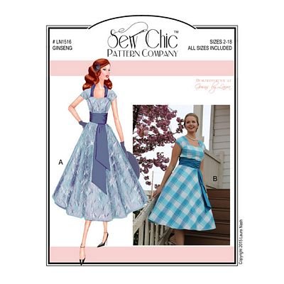 This classic feminine style is quick to make, easy to fit, and fun to wear! Suitable for both casual and formal situations, the fitted bodice with front princess seams and darted back is made all the more beautiful by a contrast shirred cummerbund, followed by a matching double layered off-center sash. Bring attention to your smile with a simple sweetheart neckline or add a contrast collar for more color. The single seam circle skirt is perfect for twirling, and raglan sleeves provide easy movement for dancing too! Closure is left side zipper.