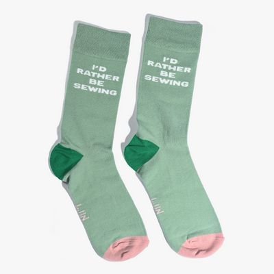 I”d Rather Be Sewing Socks. Design: Pale green background, mid green toe, pink heel and white text. Colors: Pale green, Mid green, pink and white. Material: 80% Cotton, 15% Nylon, 5% Spandex. *This item has a MAP price of $14.30. Please see policy under Shop Resources for more information*