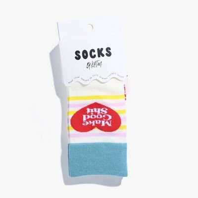 Make Good Shit Socks. Design: Cream background with text in red heart. Teal stripe at the top. Colors: Cream, red, teal, yellow yellow and pink. Material: 80% Cotton, 15% Nylon, 5% Spandex. *This item has a MAP price of $14.30. Please see policy under Shop Resources for more information*