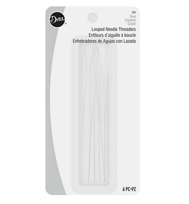 Flexible wire threader for hand machine and serger needles has a small loop to hold the thread securely as the thread passes through the eye of the needle. Can also be used for stringing beads. 6 per blister pack 3 packages per box.