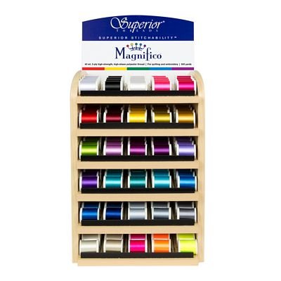 The Magnifico spool display consists of the most popular 30 colors x 5 spools each. Magnifico is a bold, strong thread created for embroidery and quilting. Magnifico is an extra-strength, high- sheen polyester that can handle the speed and tension of longarm and commercial machines, while displaying bold and beautiful shades of color. Unlike most high-strength trilobal polyester threads, Magnifico is heat set in processing, which eliminates unwanted shrinkage. A beautiful wood fixture houses the spools and conveniently sits on any table or countertop. The wood fixture measures: 13.5in wide x 25.5in tall x 9.25in deep. **Map Pricing**$6.29 per spool. This item is subject to a Minimum Advertised Pricing Policy (MAP price listed) Full Brewer MAP policy details are available for review on our website under the Shop Resource tab. **FREIGHT INTENSIVE** **Dropship** Freight Intensive items are non- returnable. dimensional weight compared to the actual weight. In addition to transportation charges, freight carriers may assess an additional oversize charge per package.
