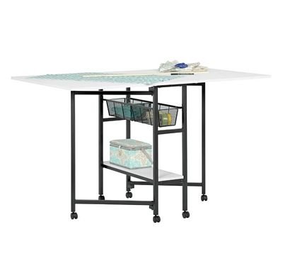 Overall Dimensions: 58.75″ W x 36.5″ D x 36.75″ H The perfect addition to your home studio design, the Sew Ready Standing Table optimizes your workspace with a sleek design. Crafted from a durable powder-coated metal frame and thick MDF tops, this foldable, standing-height art and craft table is built to last and features two large drop-leaf tops that fold down to make extra space when not in use. This foldable table doubles as a sewing machine table, making it the perfect addition to any design studio for all your sewing products.