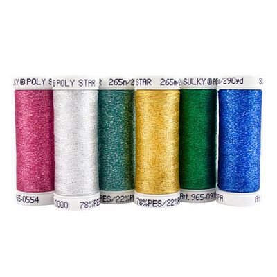 Bring in the freshness of spring with 6 spools of metallic-flecked Poly Sparkle(TM) (Star) thread. In shades of green, pink and blue these threads make great free-motion flowers, quilted teapots and sparkly embroidered raindrops.