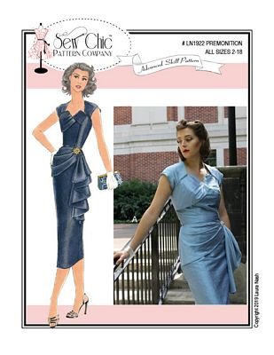 Formal or casual, this striking design is a dress you will be proud to wear anywhere. A raglan cap sleeve frames the modified sweetheart cross-over neckline with an unlined bodice. The pleated right side overlay perfectly balances the cascading skirt drape over a mid-calf fitted pencil skirt with back kick pleat. Including a dash of sparkle of your choice at the waistline is definitely recommended! A left side zipper closure finishes it off. Considered an advanced project due to asymmetry, this dress is likely easier to assemble than you think.