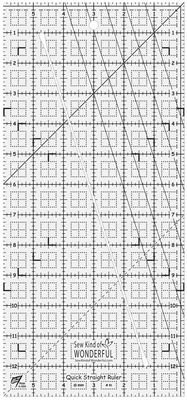 Introducing the newest tool from Sew Kind of Wonderful- Quick Straight Ruler(TM). This 6in x 13in piecing ruler has an angled straight slot for easily cutting fabric. The Quick Straight Ruler(TM) has multiple patterns that use this unique piecing ruler. The Quick Straight Ruler(TM) also has square dot grids within the inch markings to make it easy to use as an everyday ruler for general cutting and squaring-up fabric.